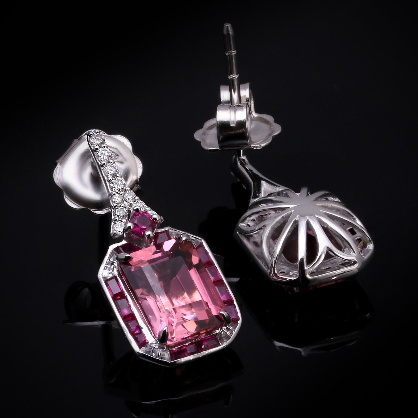 Earrings Metal: 14K White Gold Weight: 4.70 grams Main Stone: 8x6mm Emerald Cut Pink Sapphire with a total weight of 3.56 carats. Accent Stones: 2.30mm Round Ruby with a total weight of 0.10 carat. Tapered Baguette White Sapphire with a total weight of 1.07 carat. Tapered Baguette Ruby with a total weight of 1 carat. Round Diamonds with a total weight of 0.20 carat.